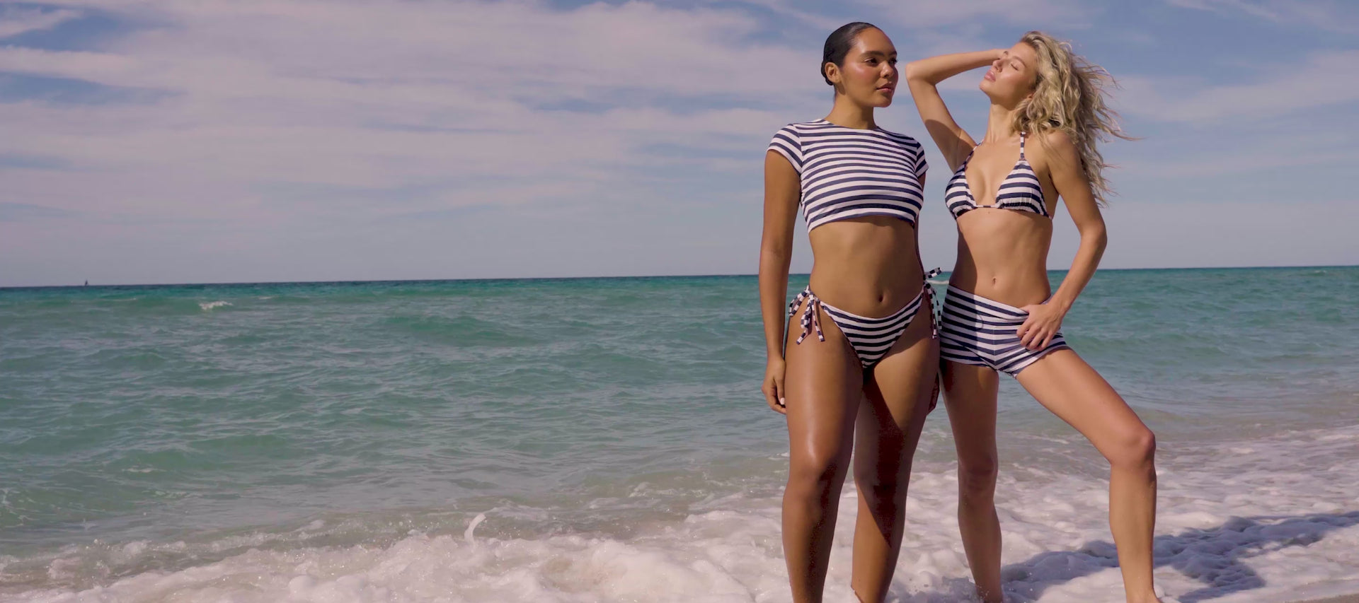 Sculpting fabrics and sporty silhouettes. New swim built for the water.
