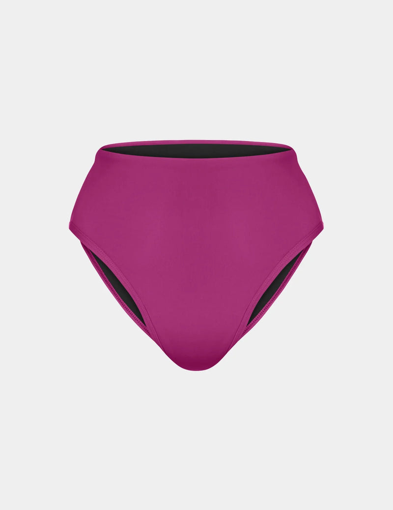 A flattering high-rise bikini bottom that has gentle tummy smoothing across the front, with mid-cut leg and cheeky bum coverage.