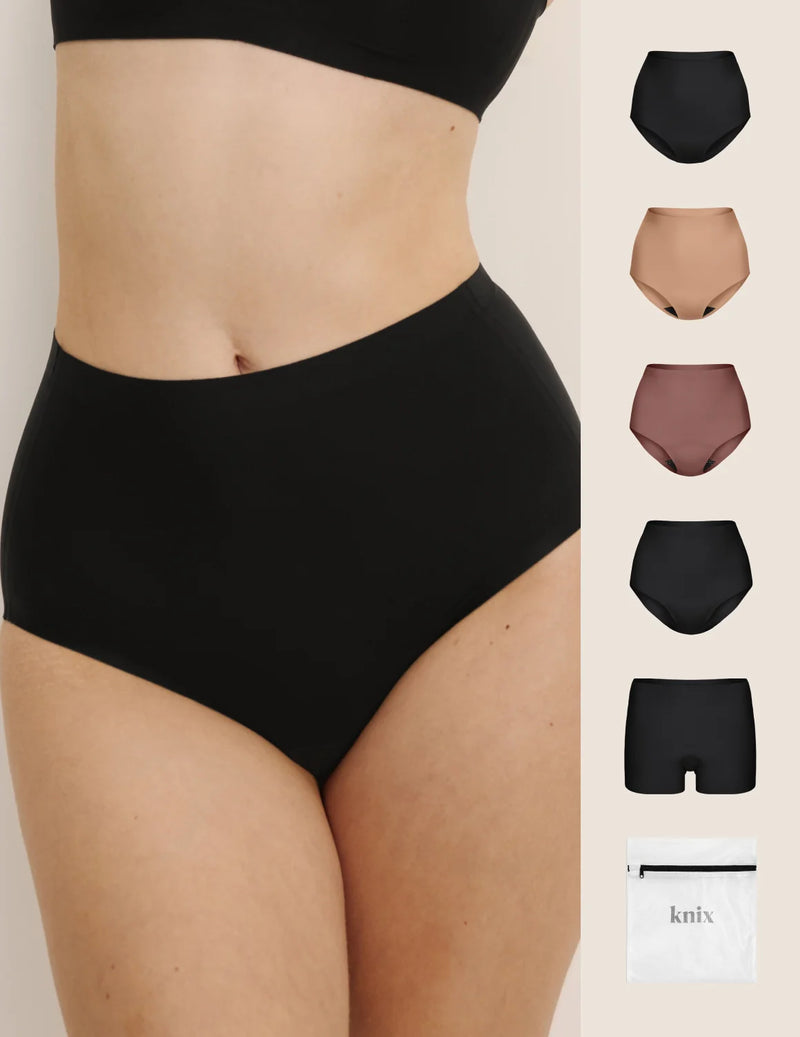 Set includes: Leakproof kit with 4 high-rise styles & 1 sleep short.