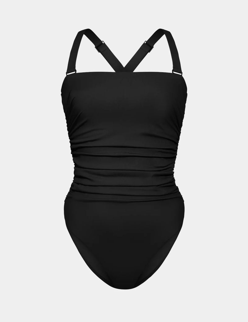 A figure-flattering suit with a square neck, removable straps and ruching along the side seam.