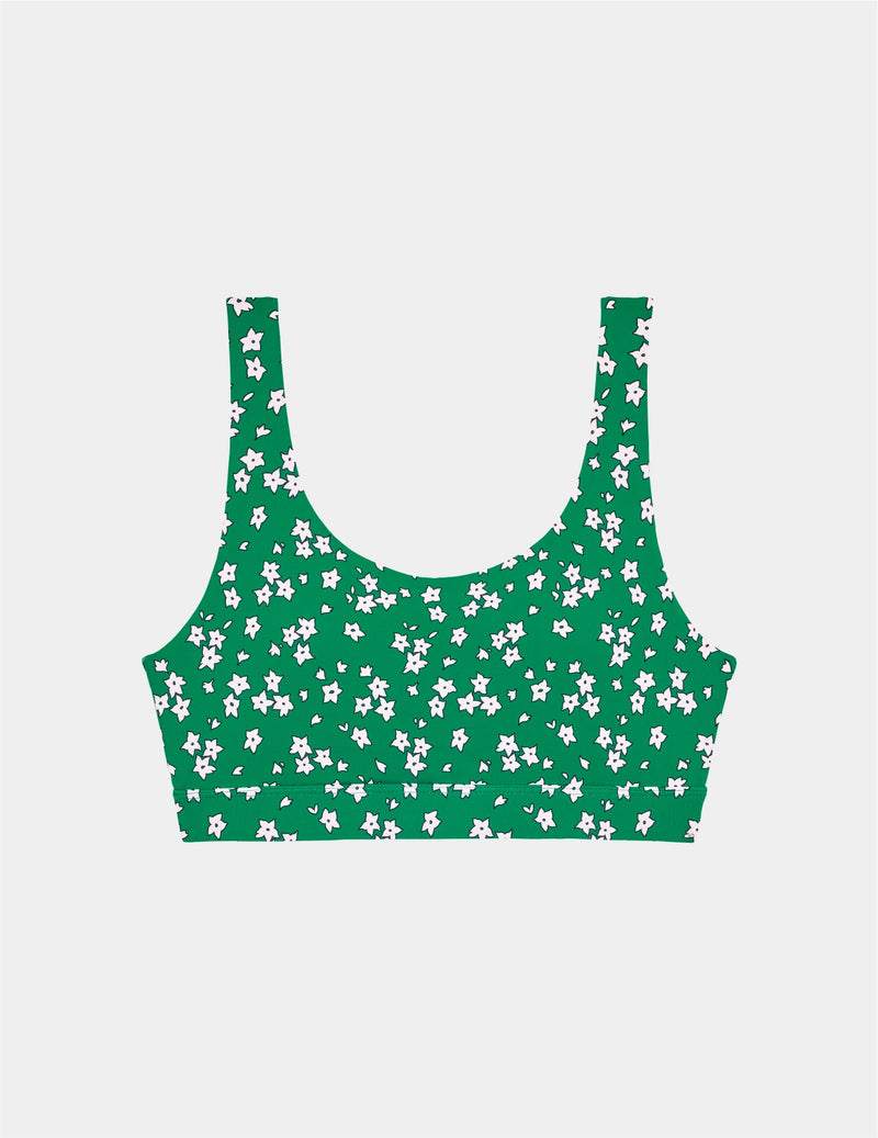 A sporty and sleek pullover top with a secure underband, thick straps, and removable cups.